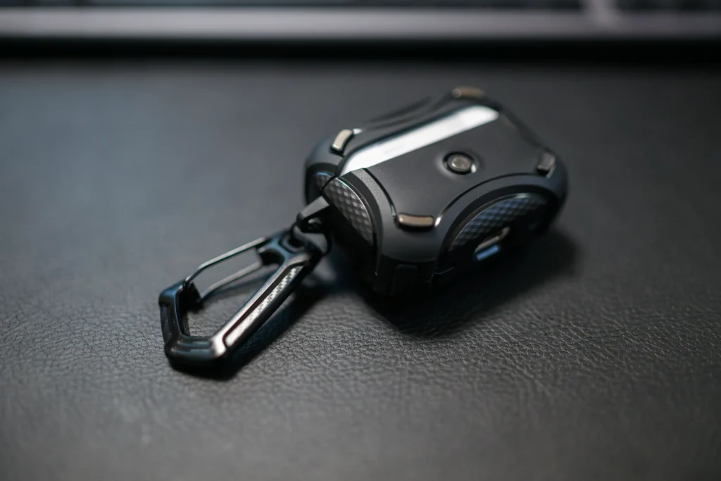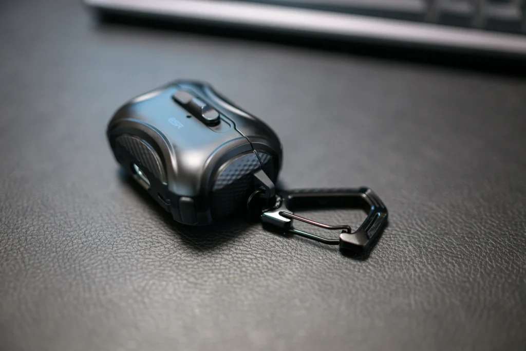AirPods Pro 2のシンプルデザインも非常に好きなんですが、こういうゴツいのも個人的には好きです。上下と左右にカーボンっぽいデザインも良い!